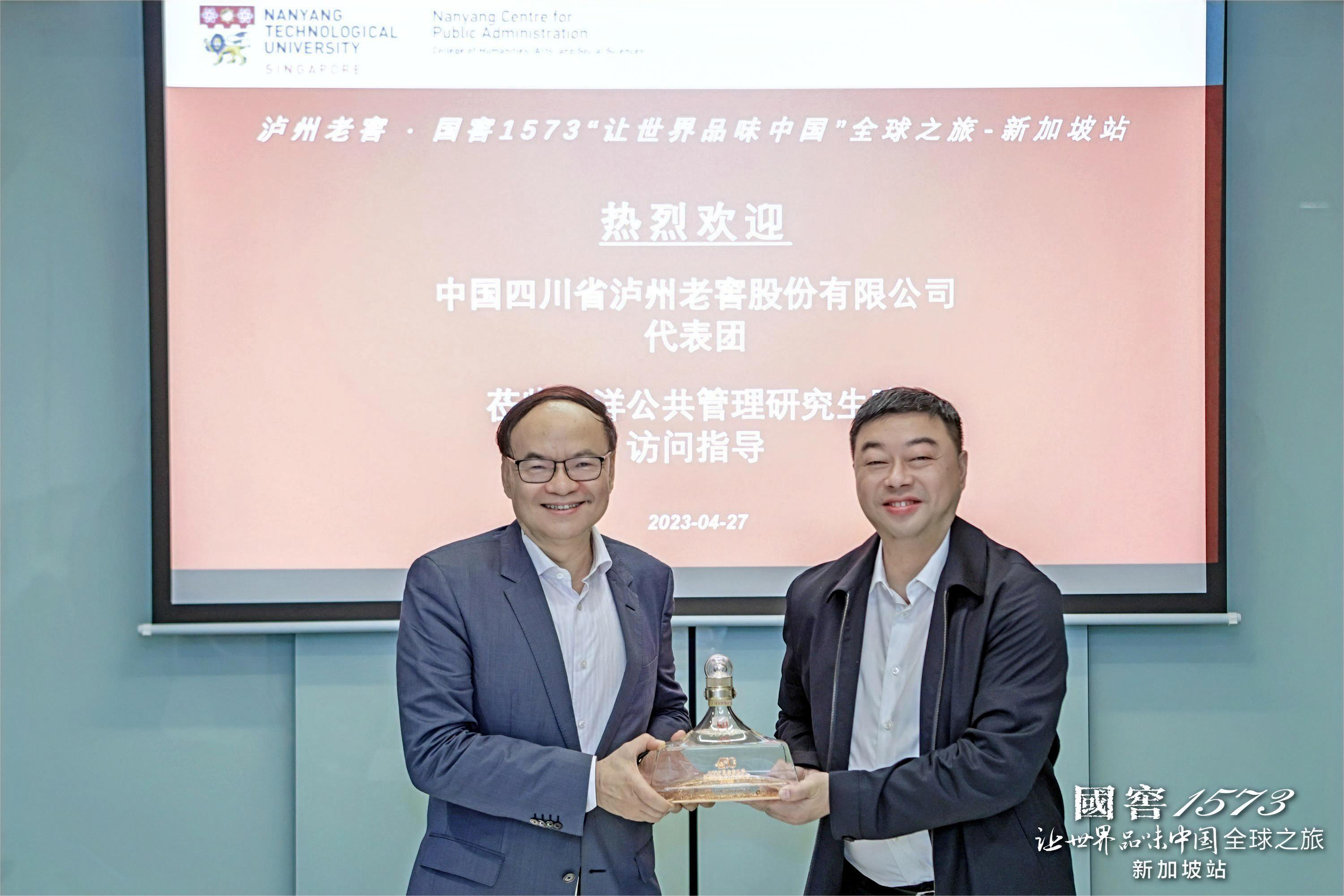 Lin Feng, General Manager of Luzhou Laojiao Co., Ltd., introduced China liquor and its liquor culture to attending professors and scholars at Nanyang University of Technology. On behalf of the company, he presented the "Guo Jiao 1573 · 450 Anniversary Commemorative Liquor Limited Edition" collection and Guo Jiao 1573 Collection jointly created by Chinese brewing master Liu Miao and contemporary art master Pang Maokun to Nanyang University of Technology in Singapore, Liu Hong, Associate Vice President of Nanyang Polytechnic University in Singapore, expressed gratitude and returned a precious gift.