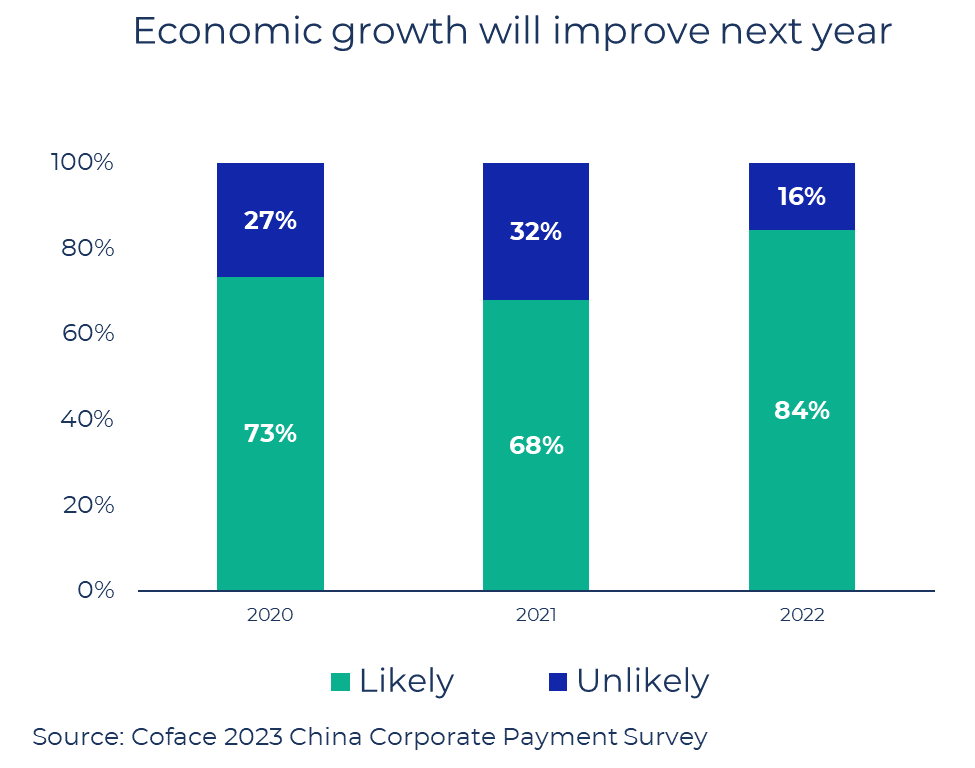 Looking ahead, respondents were increasingly optimistic about economic prospects in the next 12 months as the Chinese government transited away from its zero-Covid policy at the end of 2022. The share of respondents expecting higher economic growth rose from 68% in 2021 to 84%. Coface expects China's GDP growth to accelerate to between 4% and 5% in 2023.